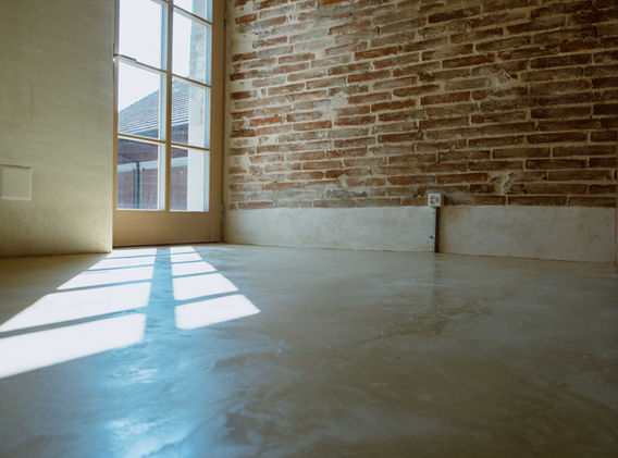 Nach der Entscheidung der Bauherrschaft für einen Kalkmörtelboden aus Lägern Kalksand wurden die Böden eingebracht. Da andere Handwerker bald weiterarbeiten mussten, konnte der geglättete Boden nach dem Abdecken nicht in seiner ursprünglichen Form belassen werden. Im weniger beanspruchten Heizungsraum wurde die geglättete Oberfläche jedoch nach einer Veredelung mit Leinöl sichtbar belassen. In Wohnung B wurde der Boden geflickt, fein abgeschliffen und so bearbeitet, dass eine terrazzoähnliche Oberfläche entstand, die ebenfalls mit Leinöl nachbehandelt wurde. In Wohnung C wurde der Boden abgeschliffen, mit einer Mischung aus Kalkspachtel und Kalkmehl versetzt, abgespachtelt und anschliessend gewachst sowie poliert. Alle verwendeten Mörtel wurden direkt vor Ort auf der Baustelle gemischt.
