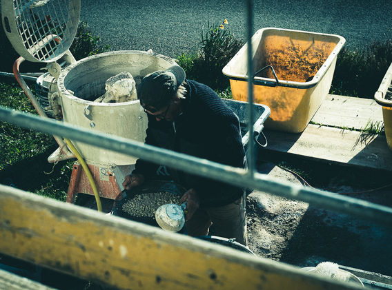 Im Rahmen einer energetischen Gebäudesanierung wurde die geschützte Fassade untersucht, wobei hydrophobe Anstriche auf den Putzen und Riegeln festgestellt wurden. Der Deckputz der Riegelfelder wurde aufgrund von Rissen und Abplatzungen vollständig entfernt und neu appliziert, anschliessend al fresco mit Kalkfarbe gestrichen. Das Sockelgeschoss und die Riegel wurden sandgestrahlt, um die bestehende Farbe zu entfernen. Der Deckputz am Sockel musste ebenfalls entfernt werden, da er in schlechtem Zustand und falsch materialisiert war. Im neu aufgetragenen Oberputz wurde aufgrund des bestehenden zementhaltigen Sockelputzes dem Kalkmörtel etwas Zement beigemischt. Die abschliessende Kalkfarbe wurde mit holzgebranntem Liesberger Kalk und Kalkmehl gefertigt und aufgetragen.